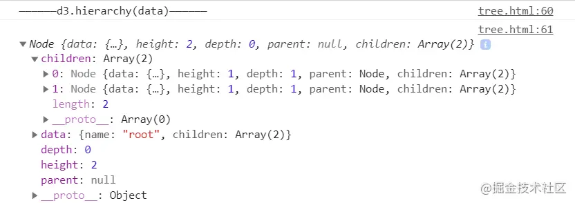 我们可以看到,相对初始数据,经过d3.hierarchy处理后,节点的数据类型变为了Node(Object),同时返回了相应的depth及height