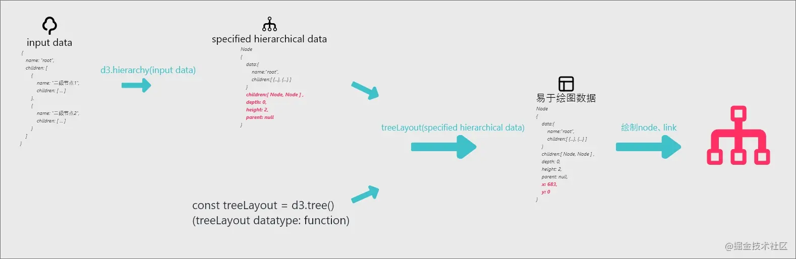 - const nodesData = treeLayout( hierarchyData ) - 通过layout获得易于d3方便绘图的数据