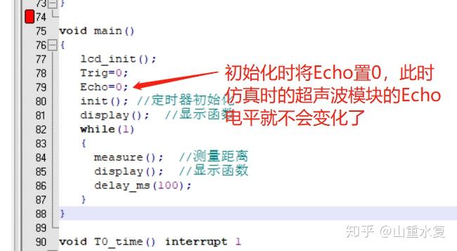 可以看到,这里正常应该是有一个除以2的,但我在实际测试中发现,proteus中的超声波模块显示的距离,发回给我的信号并没有除以2,因此我就没有除,也可能是我部分步骤有问题,欢迎指正,也可以根据自己情况进行修改。