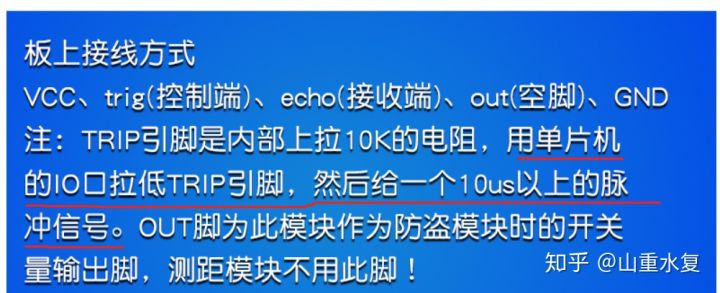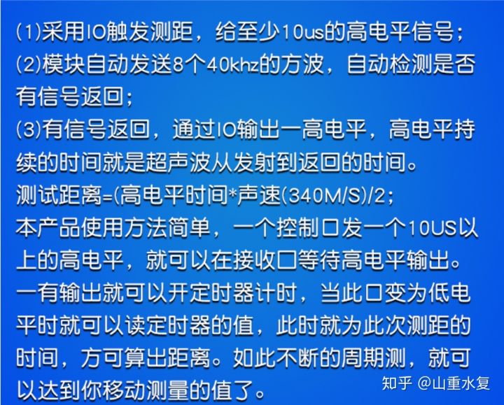 这个写得清楚明白,简单易懂,就是先将Trig脚拉低,然后给到Trig引脚一个至少10us的高电平信号,然后再拉低。之后模块就会自动向外发送超声波,我们只需要等待Echo管脚变为高电平就可以了。这个Echo管脚高电平的时间就带有距离信息。具体的距离计算公式也给出了:
