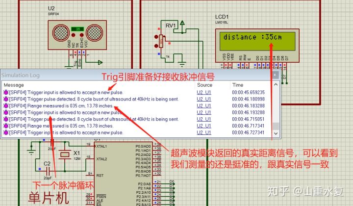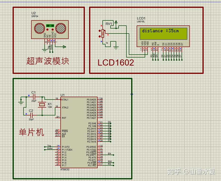 使用一个1602来显示距离,具体1602的驱动程序的文章,可以查看我之前的文章:【Proteus】单片机配合矩阵键盘LCD1602制作简易计算器 - 知乎