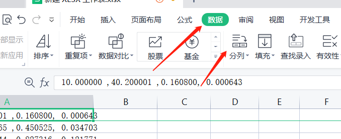此时数据全在一列下,我们需要将数据分割开,点击数据->分列: