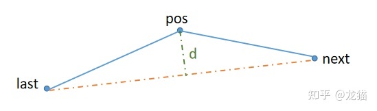 垂距限值法的思想也是比较简单的,概括一下就是:计算当前节点到上节点与下节点连线的距离,超过一定的阈值就从总集合中删除当前点。总体思想就如它的名字一样。