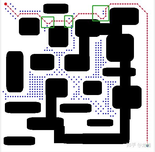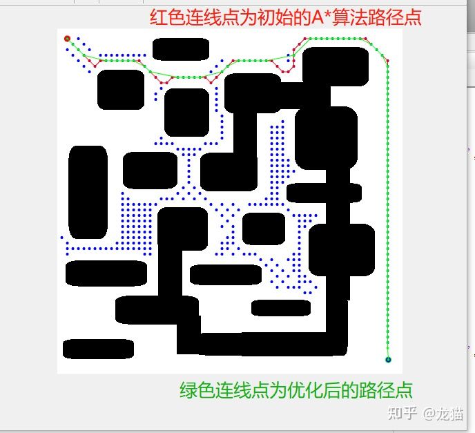 上图中红色连线点为初始的A*算法路径点,绿色连线点为优化后的路径点