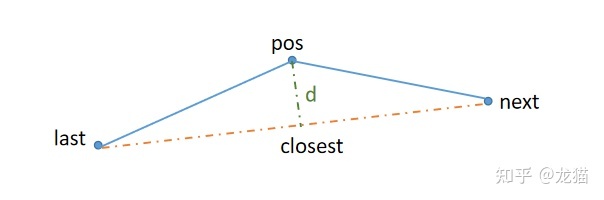 2) 计算向量last_to_pos,之后计算last_to_pos与向量u_last_to_next的点乘,即为last_to_pos到向量u_last_to_next上的投影长度L