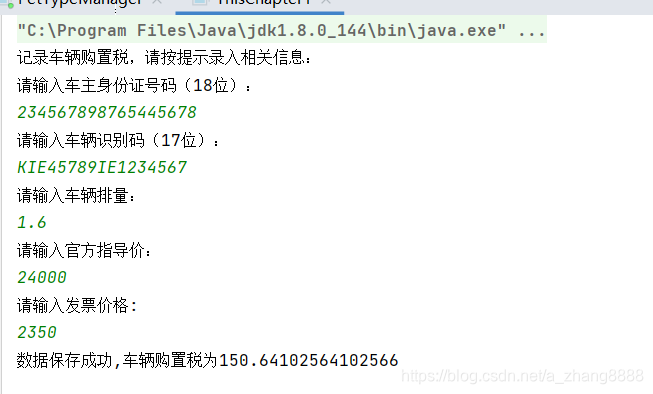 System.out.println("数据保存成功,车辆购置税为"+money);