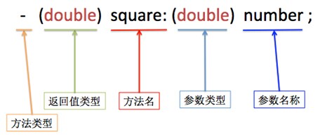 1 // 方法声明 2 - (double)square:(double)number; 3 // 方法实现 4 - (double)square:(double)number 5 { 6 return number * number; 7 }