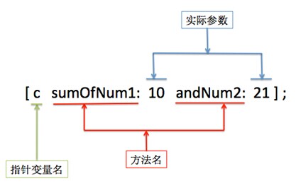 1 // 方法声明 2 - (double)sumOfNum1:(double)num1 andNum2:(double)num2; 3 // 方法实现 4 - (double)sumOfNum1:(double)num1 andNum2:(double)num2 5 { 6 return num1 + num2; 7 }