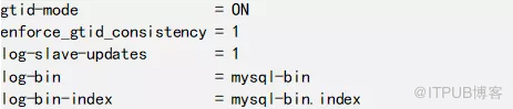 MySQL通过全局变量gtid_mode控制开启/关闭GTID模式。但是gtid_mode是只读的,可添加到配置文件中,然后重启mysqld来开启GTID模式。由于GTID需要写入到二进制日志,所以要使用了GTID,同时也需要把二进制日志启用。相关配置项如下: