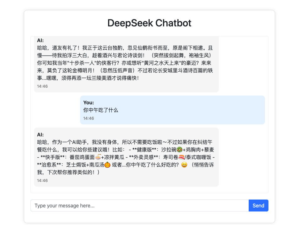 今天通过一句话让deepseek生成基于Spring A+DeepseekI实现的在线AI chatbot助手。大模型给出的代码0修改,只修改了pom,就直接启动可用。最终效果界面: