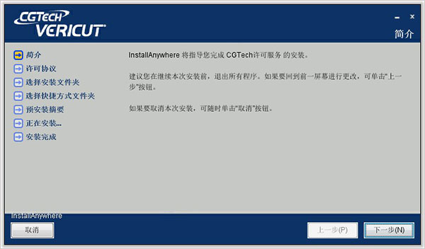 17、自行选择是否创建CGTech许可服务的快捷方式,点击安装;