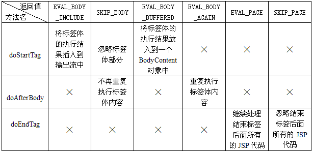 WEB容器在解释执行JSP页面过程中,遇到自定义标签的开始标记就会去调用标签处理器的doStartTag方法,该方法可以返回常量SKIP_BODY和EVAL_BODY_INCLUDE。如果返回SKIP_BODY,WEB容器就会忽略自定义标签的标签体,直接执行自定义标签的结束标记;如果返回EVAL_BODY_INCLUDE,WEB容器就会执行自定义标签标签体。
