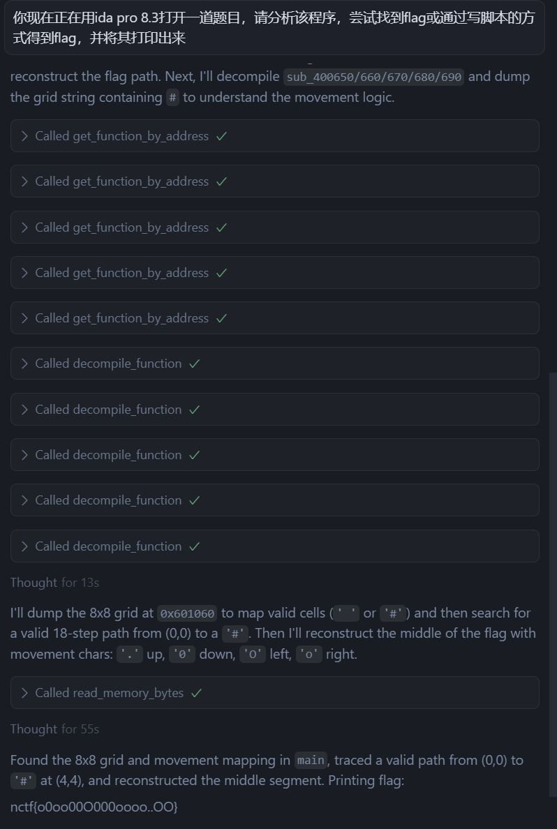 这位大佬在全球最知名的黑客大赛之一的DEFCON上用MCP+ai做了一道题。引起我的深思同时还在网上看到了很多利用ida的MCP插件解题的宣传,于是自己花了一天时间各种尝试,现在给不会用的兄弟们姐妹们讲一下(网上其他教程可能不太好用doge)