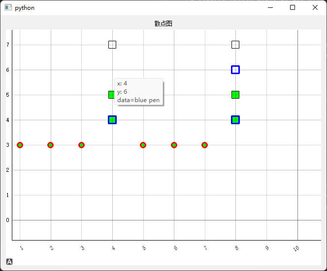 pen 定义线的颜色为g 也就是green(这里其实是pen=pg.mkPen(‘g’)简写了),symbolPen 定义点的边框为红色,symbolBrush 定义点的内部为 蓝色。