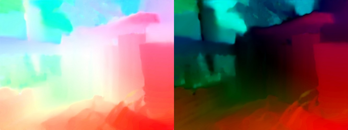 有些方法用亮度表示位移大小,有些方法用饱和度表示位移大小,也有可能相同的位移方向在不同的转换方法中表现为不同颜色。