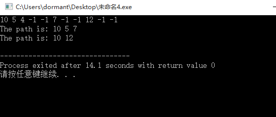 1 #include<iostream> 2 #include<vector> 3 using namespace std; 4 5 typedef struct BiTreeNode{ 6 int data; 7 struct BiTreeNode *left; 8 struct BiTreeNode *right; 9 }BiTreeNode; 10 11 void FindPathCore(BiTreeNode *pHead, int sum, vector<int>& path, int currentSum){ 12 currentSum += pHead->data; 13 path.push_back(pHead->data); 14 15 //如果是叶子节点,并且路径上的节点的等于输入的值,打印这条路径 16 bool isLeaf = pHead->left == NULL && pHead->right == NULL; 17 if(currentSum == sum && isLeaf){ 18 cout<<"The path is: "; 19 vector<int>::iterator iter = path.begin(); 20 for(; iter != path.end(); ++iter){ 21 cout<<*iter<<' '; 22 } 23 24 cout<<endl; 25 } 26 27 //如果不是叶子节点,需要遍历它的子节点 28 if(currentSum < sum && pHead->left != NULL){ //如果当前的和已经大于期望的和,那么久不需要再向下寻找了 29 FindPathCore(pHead->left, sum, path, currentSum); 30 } 31 if(currentSum < sum && pHead->right != NULL){ 32 FindPathCore(pHead->right, sum, path, currentSum); 33 } 34 //返回父节点之前,在路径上删除当前节点 35 path.pop_back(); 36 } 37 38 void FindPath(BiTreeNode *pHead, int sum){ 39 if(pHead == NULL){ 40 return ; 41 } 42 43 vector<int> path; 44 int currentSum = 0; 45 FindPathCore(pHead, sum, path, currentSum); 46 } 47 48 BiTreeNode *createTree(){ //前序遍历的方法创建一棵二叉树 49 int item; 50 BiTreeNode *pNode = NULL; 51 cin>>item; 52 53 if(item != -1){ 54 BiTreeNode *tmp = new BiTreeNode(); 55 pNode = tmp; 56 tmp->data = item; 57 58 pNode->left = createTree(); 59 pNode->right = createTree(); 60 61 return pNode; 62 } 63 else{ 64 pNode = NULL; 65 return pNode; 66 } 67 } 68 69 int main(){ //测试方法 70 BiTreeNode *test = createTree(); 71 FindPath(test, 22); 72 return 0; 73 }