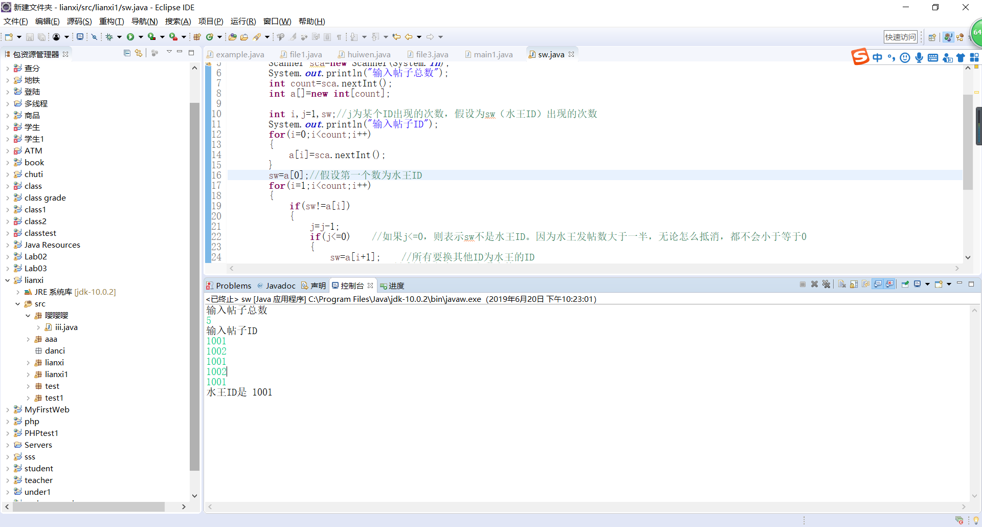 package lianxi1; import java.util.*; public class sw { public static void main(String[] args) { Scanner sca=new Scanner(System.in); System.out.println("输入帖子总数"); int count=sca.nextInt(); int a[]=new int[count]; int i,j=1,sw;//j为某个ID出现的次数,假设为sw(水王ID)出现的次数 System.out.println("输入帖子ID"); for(i=0;i<count;i++) { a[i]=sca.nextInt(); } sw=a[0];//假设第一个数为水王ID for(i=1;i<count;i++) { if(sw!=a[i]) { j=j-1; if(j<=0) //如果j<=0,则表示sw不是水王ID。因为水王发帖数大于一半,无论怎么抵消,都不会小于等于0 { sw=a[i+1]; //所有要换其他ID为水王的ID j=1; //重新定义水王ID出现次数 i++; } } else { sw=a[i]; j=j+1;//统计水王帖子数 } } System.out.println("水王ID是 "+sw); } }