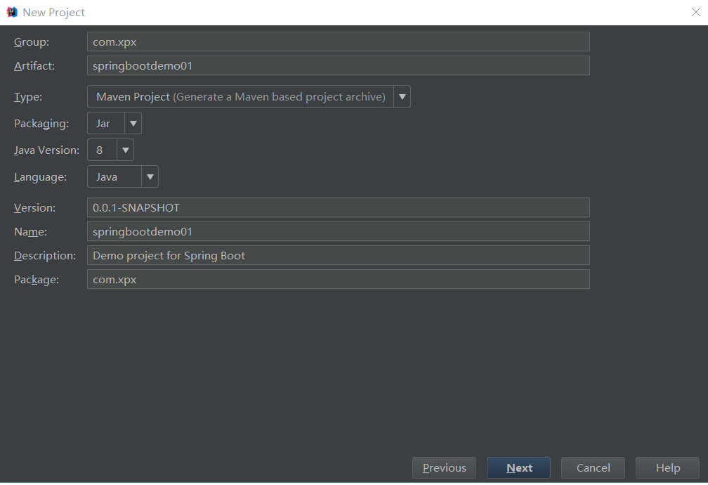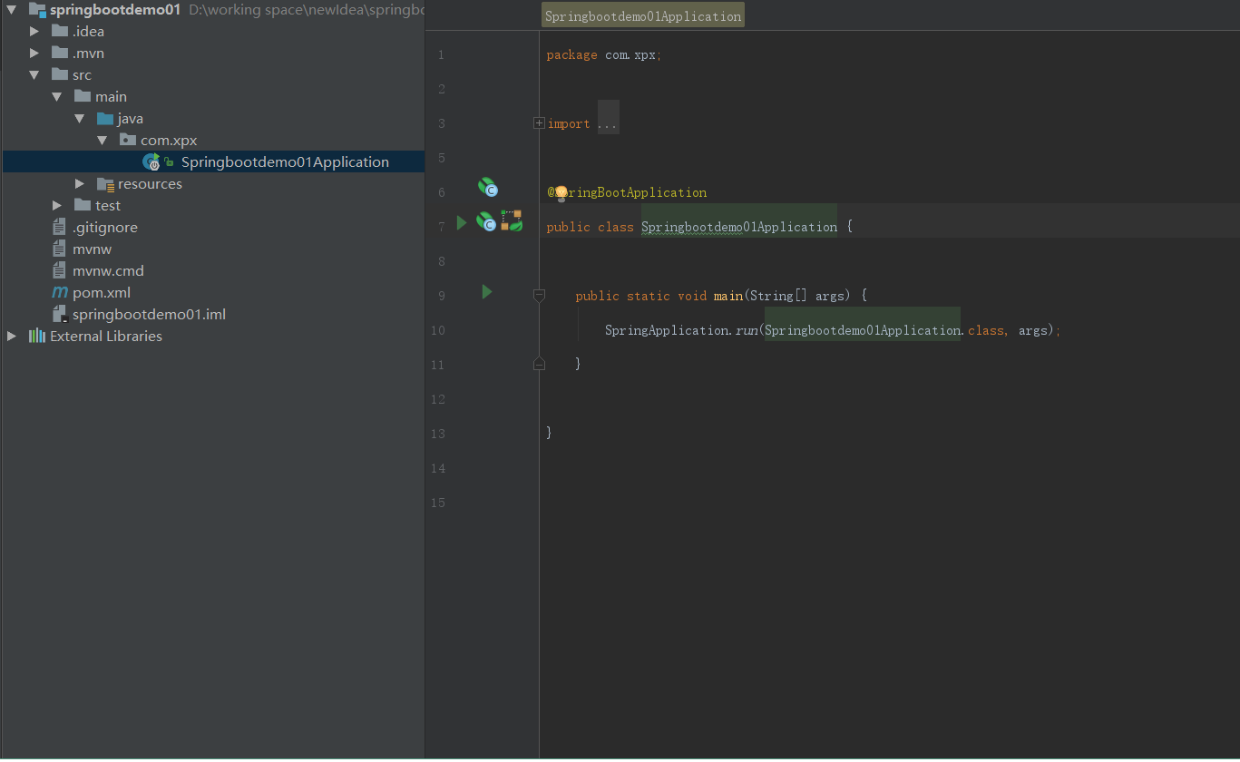 <?xml version="1.0" encoding="UTF-8"?> <project xmlns="http://maven.apache.org/POM/4.0.0" xmlns:xsi="http://www.w3.org/2001/XMLSchema-instance" xsi:schemaLocation="http://maven.apache.org/POM/4.0.0 http://maven.apache.org/xsd/maven-4.0.0.xsd"> <modelVersion>4.0.0</modelVersion> <parent> <groupId>org.springframework.boot</groupId> <artifactId>spring-boot-starter-parent</artifactId> <version>2.1.1.RELEASE</version> <relativePath/> <!-- lookup parent from repository --> </parent> <groupId>com.xpx</groupId> <artifactId>springbootdemo01</artifactId> <version>0.0.1-SNAPSHOT</version> <name>springbootdemo01</name> <description>Demo project for Spring Boot</description> <properties> <java.version>1.8</java.version> </properties> <dependencies> <dependency> <groupId>org.springframework.boot</groupId> <artifactId>spring-boot-starter-web</artifactId> </dependency> <dependency> <groupId>org.springframework.boot</groupId> <artifactId>spring-boot-starter-test</artifactId> <scope>test</scope> </dependency> </dependencies> <build> <plugins> <plugin> <groupId>org.springframework.boot</groupId> <artifactId>spring-boot-maven-plugin</artifactId> </plugin> </plugins> </build> </project>