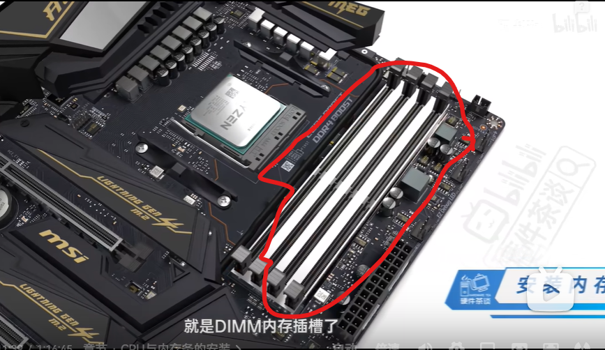 内存是电脑的草稿纸,负责临时存放当前正在运行和计算的数据,目前主流的是DDR4内存,使用的插槽是主板上的DIMM。如下图所示,这个长条形状的就是DIMM内存插槽。
