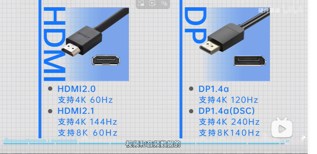 显卡安装完毕之后就可以直接接上显示器和电源线还有键盘鼠标开机使用了。如果你没有安装独立显卡,使用的是CPU自带的核心显卡,那就请将你的显示器接驳在主板的视频接口上,而你如果安装了独立显卡,请务必把你的显示器接驳在显卡的视频接口上,千万不要接在主板上,绝大多数主板在安装了独立显卡之后,会屏蔽主板的视频输出,接上去以后,开机显示器是黑屏无信号的。等腰梯形这个接口是HDMI接口,直角梯形这个接口是DP接口,一些老式显卡上还会有这种白色的DVI接口以及蓝色的VGA接口,绝大多数显示器都是使用的HDMI接口和DP接口。如果你发现显示器的接口和显卡的接口不匹配。可以自行去网上购各类型的转接头。HDMI接口和DP接口都是用来传输视频和音频数据的。