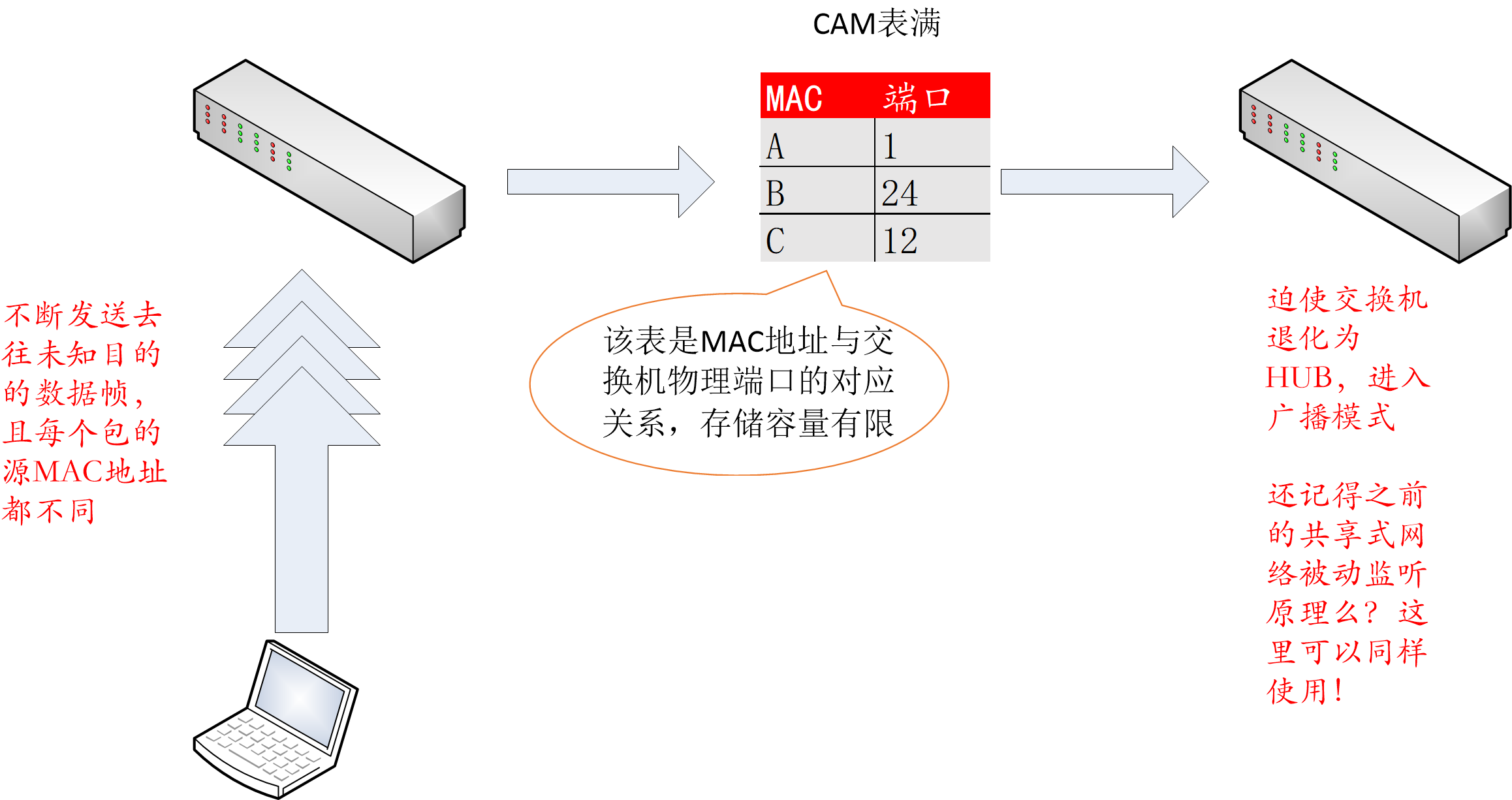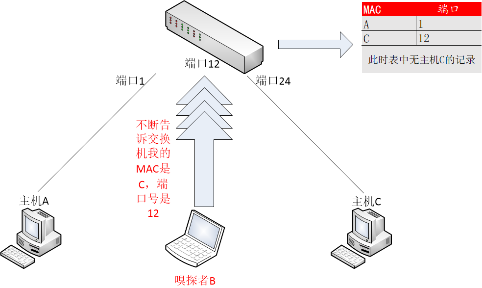 这种攻击也就是对 CAM 进行泛洪攻击。CAM 表中存储有 每台连接的主机的MAC 地址和其在交换机对应的端口号,以及他们的 VLAN 信息,CAM 表有固定的容量,只能存储一定数目的条目,而攻击者让网络中大量涌入含有不同源 MAC 地址的伪造的无故 ARP 数据包,逼迫交换机退化为集线器,如同共享式网络,只能进行广播,嗅探变得轻而易举。如图下图所示: