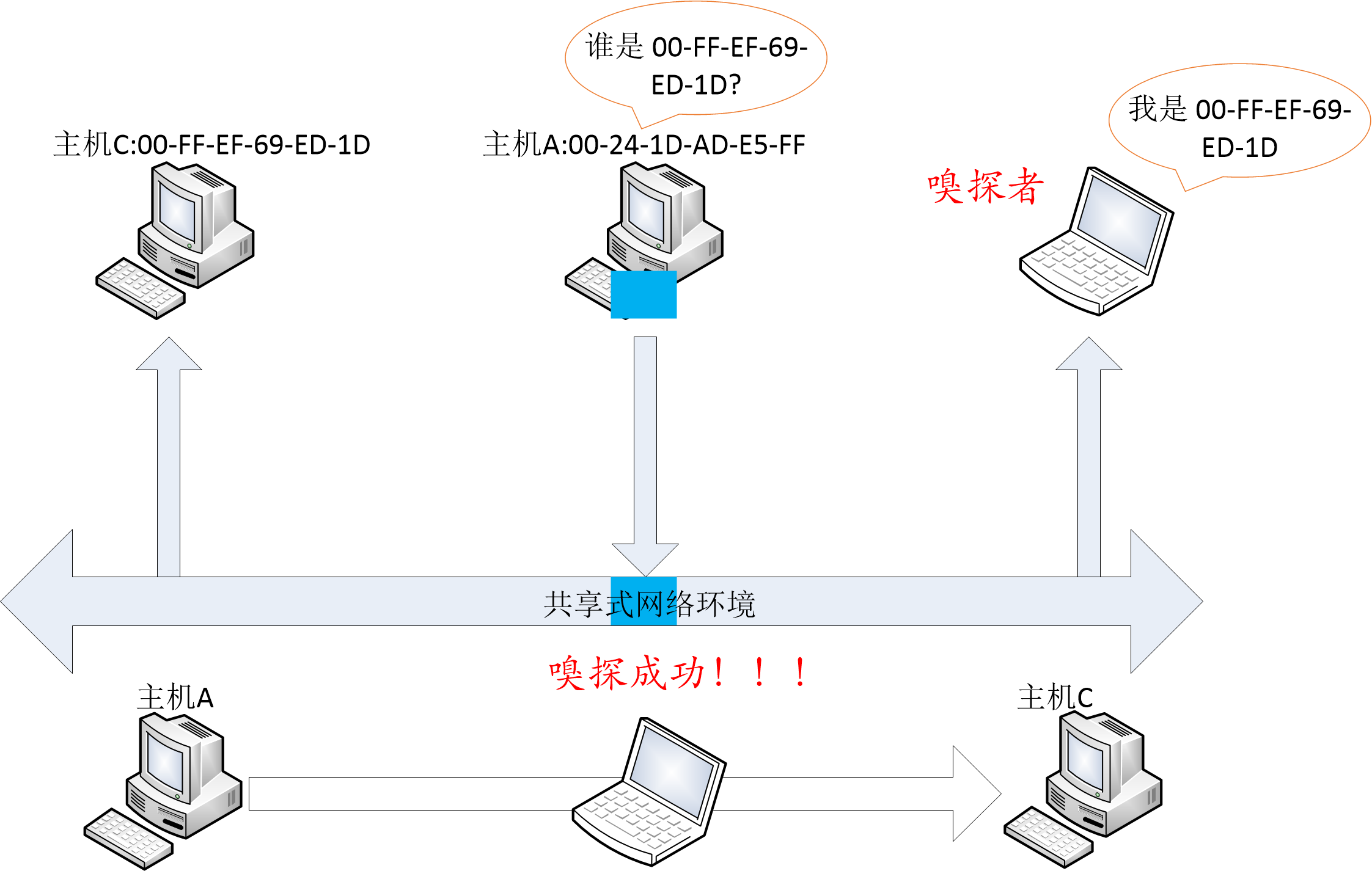 {即为:(前提是主机A、B、C和嗅探者都属于共享网络同一网段)