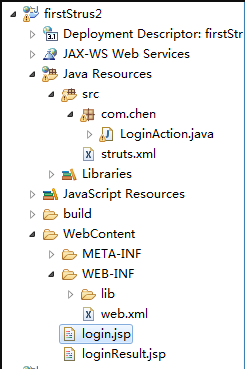 1、在eclipse中创建一个web工程,并导入struts2的关键jar包到WEB-INF的lib目录下。并在WebContext根目录下创建web.xml,在源文件目录src下创建struts.xml。再创建login.jsp和loginResult.jsp两个jsp文件,用于显示登录界面和登录成功界面。最后创建一个Action类,放在自定义的包下。目录和文件创建完毕,总体目录文件结构如下: