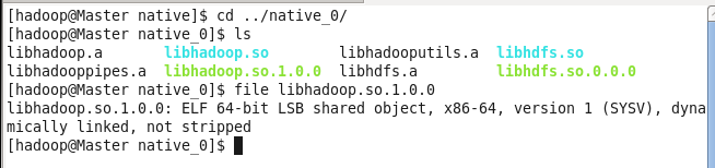 到$HADOOP_HOME/lib/native下,查看文件libhadoop.so.1.0.0,显示Hadoop的位数,是64位。