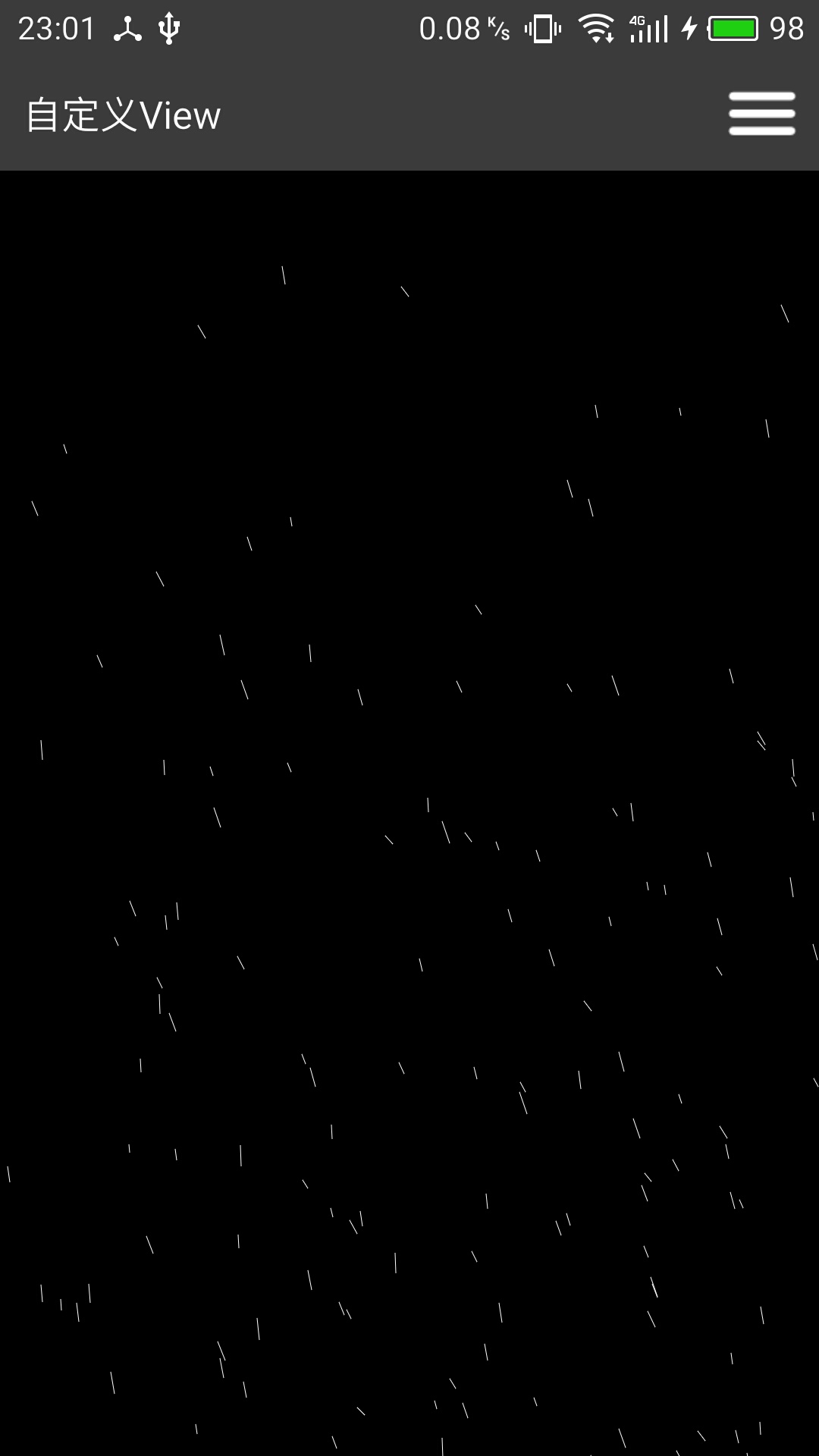 1 /** 2 * Created by LinGuanHong on 2017/1/15. 3 */ 4 5 public class RainItem extends BaseItem { 6 7 private float opt; 8 private int sizeX,sizeY; /** 充当角度 */ 9 private int startX,startY,stopX,stopY; 10 private Paint paint; 11 private Random random; 12 13 public RainItem(int width, int height, Resources resources) { 14 super(width,height,resources); 15 init(); 16 loopInit(); 17 } 18 19 @Override 20 public void move() { 21 startX += sizeX * opt; 22 stopX += sizeX * opt; 23 24 startY += sizeY * opt; 25 stopY += sizeY * opt; 26 if(startY > height){ 27 loopInit(); 28 } 29 } 30 31 @Override 32 public void draw(Canvas canvas) { 33 Log.d("zzzzz","drawView "+startX+" "+startY+" "+stopX+" "+stopY); 34 canvas.drawLine(startX,startY,stopX,stopY,paint); 35 } 36 37 private void loopInit(){ 38 sizeX = 1 + random.nextInt(10); 39 sizeY = 10 + random.nextInt(20); 40 41 startX = random.nextInt(width ); 42 startY = random.nextInt(height); 43 44 opt = 0.2f + random.nextFloat(); 45 46 stopX = startX + sizeX; 47 stopY = startY + sizeY; 48 } 49 50 private void init(){ 51 paint = new Paint(Paint.ANTI_ALIAS_FLAG); /** 抗锯齿 */ 52 paint.setColor(0xffffffff); /** a,r,g,b 255,255,255,255 */ 53 54 random = new Random(); 55 } 56 57 }