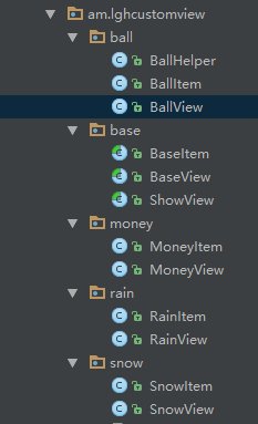 OK,到这里基础的类都搞定了,为什么说是适配器模式呢,其实 BaseItem 就是 ViewHolder,ShowView 是 BaseAdapter,下面放下雨的Item 类和雨景。