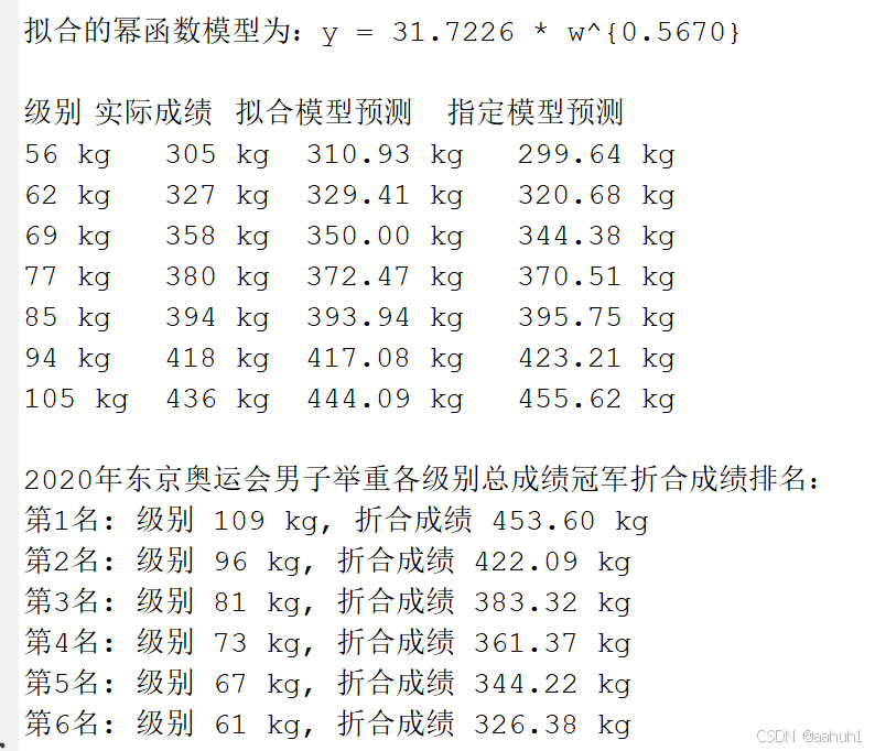 通过对举重运动员的级别和成绩数据进行对数变换,使用线性回归拟合幂函数模型,从而预测不同重量级别下的成绩,并比较拟合模型与指定模型的预测值,同时计算并排名2020年东京奥运会的折合成绩。