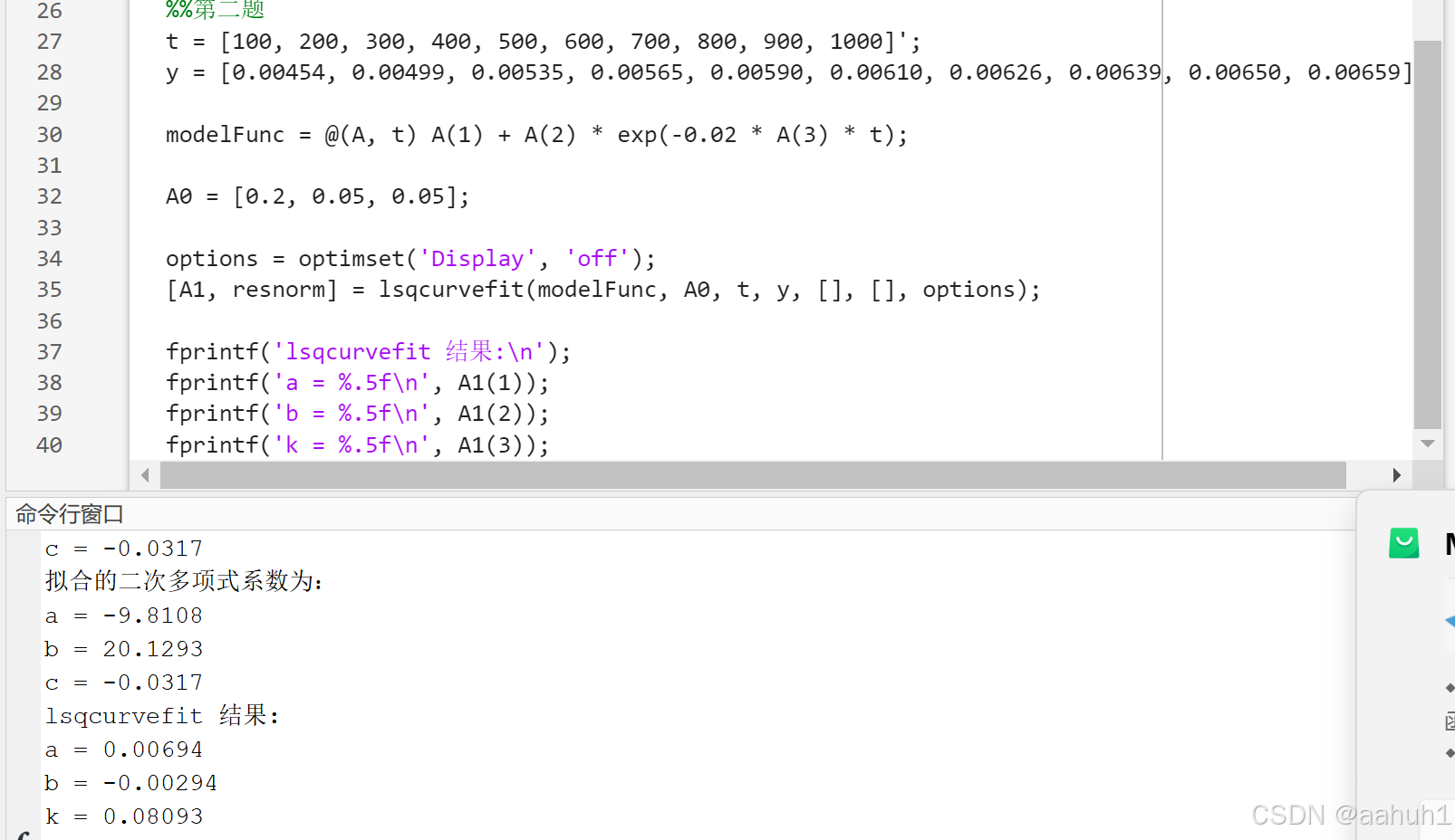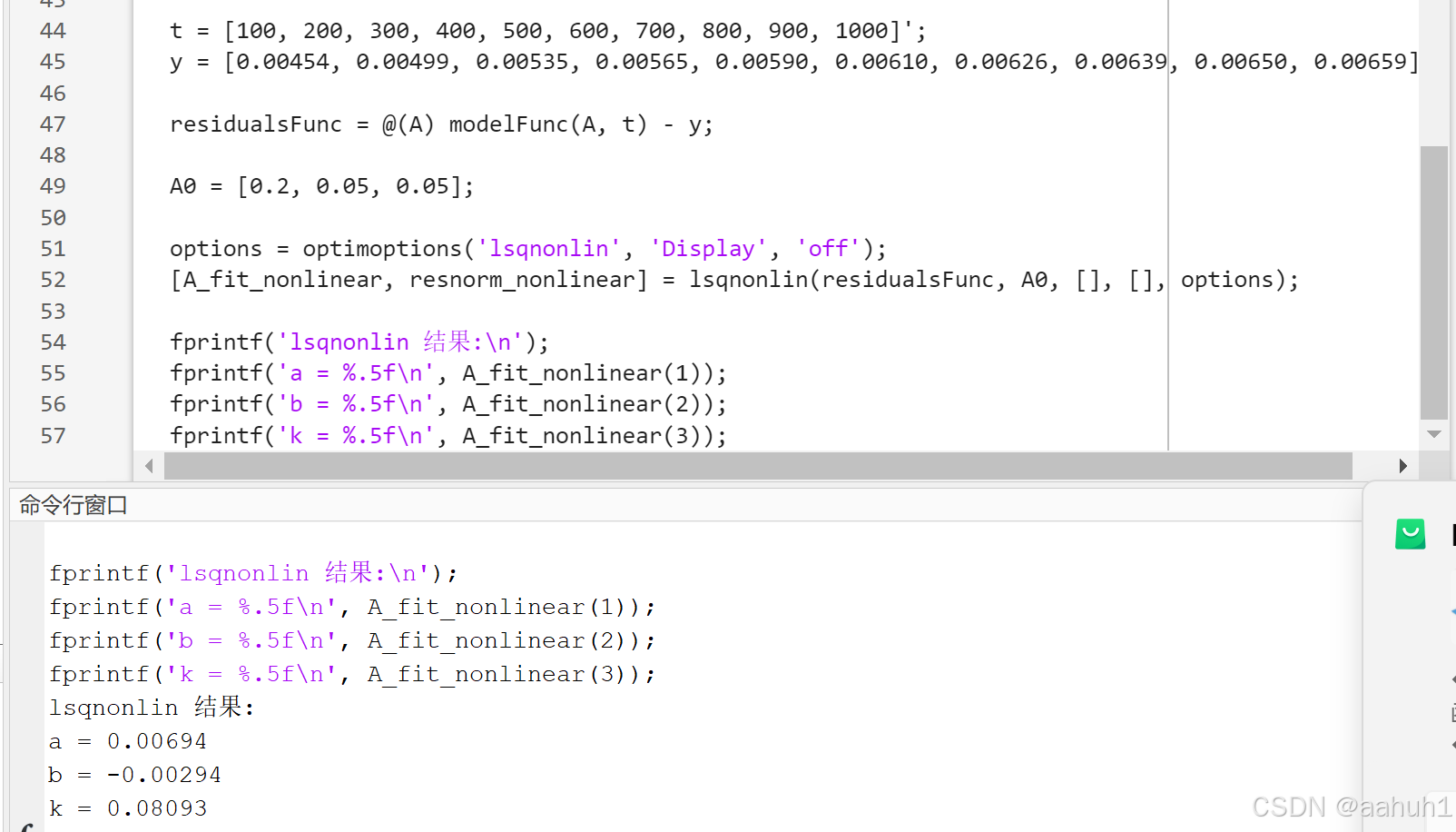 分析:使用 lsqnonlin 进行拟合,返回最佳参数和残差平方和。