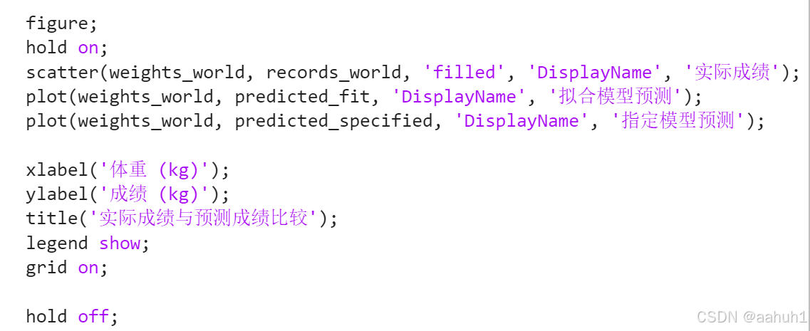 将实际成绩与拟合模型和指定模型的预测值进行比较,以评估模型的准确性。通过输出的表格,可以直观地观察到哪个模型更接近实际成绩。