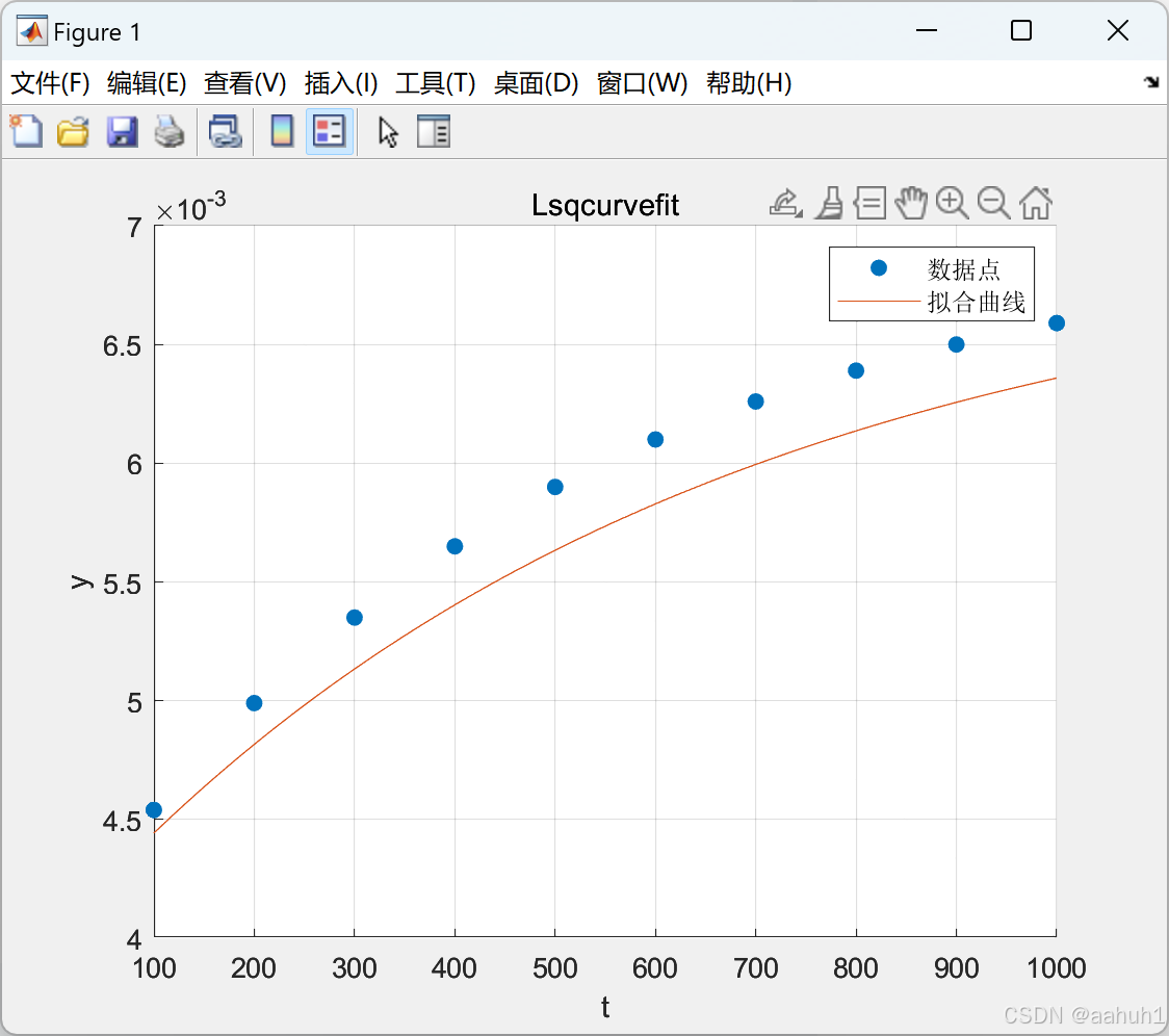 分析:使用 lsqcurvefit 函数进行非线性最小二乘拟合。modelFunc 是待拟合的模型,A0 是初始猜测,t 和 y 是数据,options 用于控制输出信息。返回值 A1 是拟合得到的参数,resnorm 是残差平方和。