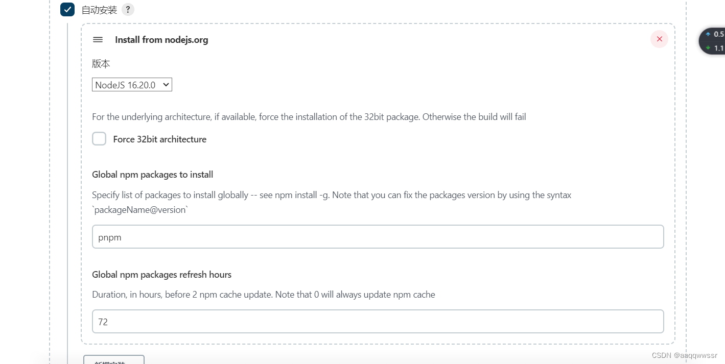 解决方式1:在全局工具配置中选择自动安装nodejs,在下面的安装全局中填入pnpm