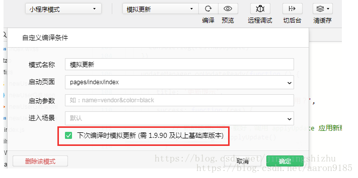 3、编译时记得勾上‘下次编译时模拟更新(需1.9.90及以上基础库版本)’,才能模拟出更新效果