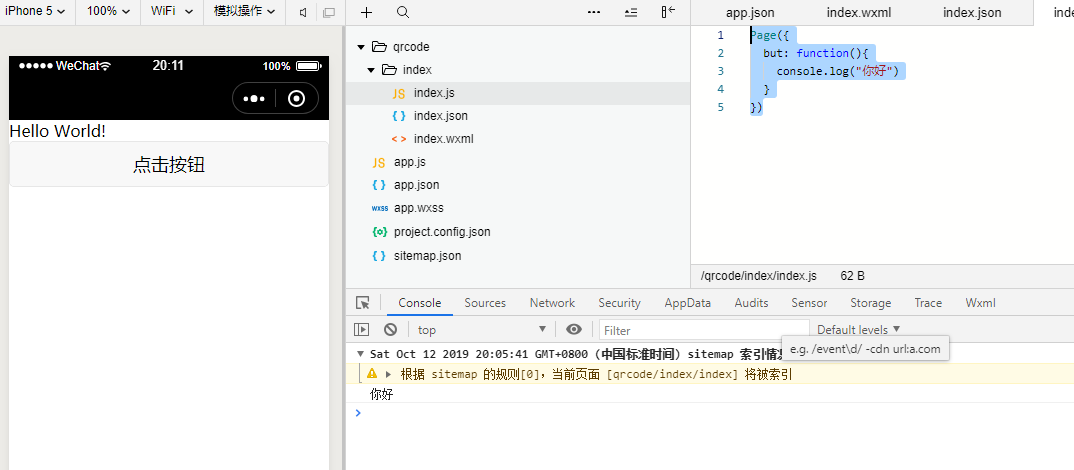 // index.wxml <view>Hello World!</view> <button bindtap="but">点击按钮</button> // 按钮 bindtap属性就是添加点击事件,名字是but // index.js Page({ but: function(){ // 通过but点击事件触发后面的函数 console.log("你好") } })