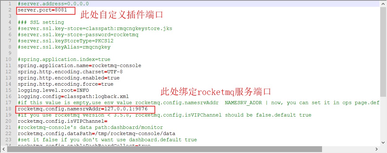 下载完成之后,进入‘rocketmq-externals\rocketmq-console\src\main\resources’文件夹,打开‘application.properties’进行配置。如下: