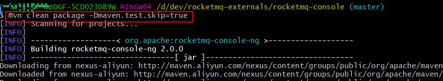 进入‘\rocketmq-externals\rocketmq-console’文件夹,执行‘mvn clean package -Dmaven.test.skip=true’,编译生成。