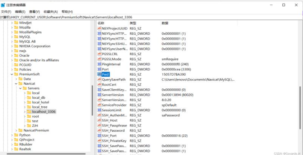 2.路径: 计算机\HKEY_CURRENT_USER\SOFTWARE\PremiumSoft\Navicat\Servers