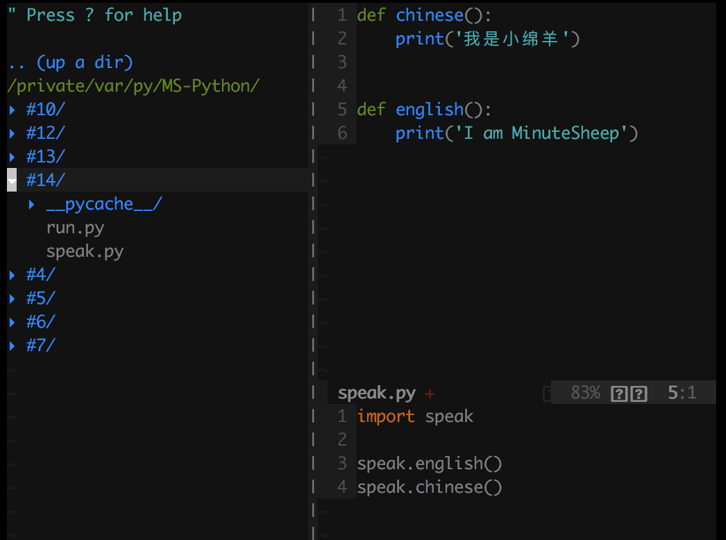 1 # speak.py 2 # speak模块 3 4 def chinese(): 5 print('我是小绵羊') 6 7 8 def english(): 9 print('I am MinuteSheep')