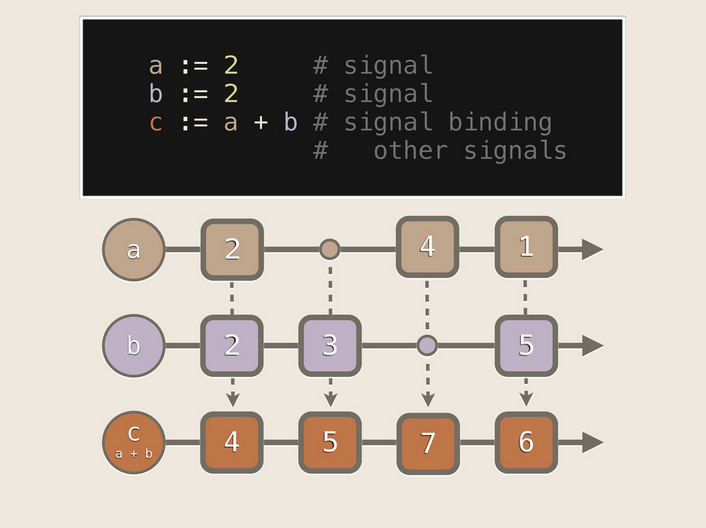 关于函数响应式编程的东西,我想引用国外这个ReactiveCocoa教学视频(视频链接https://vimeo.com/65637501)中的一张PPT来简单的说一下什么是函数响应式编程。那就直接上图,下图是上方视频链接的截图,很形象的解释了什么是函数响应式编程。简单的说下方c = a + b 定义好后,当a的值变化后,c的值就会自动变化。不过a的值变化时会产生一个信号,这个信号会通知c根据a变化的值来变化自己的值。b的值变化同样也影响c的值。下图很好的表达了这个思想。在此就不做赘述了。