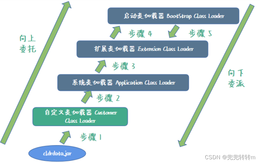 Tips:我们可以看到,在向上委托的过程中,cldrdata.jar 虽然在步骤 3 已经达到了扩展(Extension)类加载器,但是由于扩展(Extension)类加载器需要遵循向上委托的原则,必须要将 cldrdata.jar 向上委托给启动(Bootstrap)类加载器,直到启动(Bootstrap)类加载器向下委派 cldrdata.jar 到扩展(Extension)类加载器才进行类库的加载。