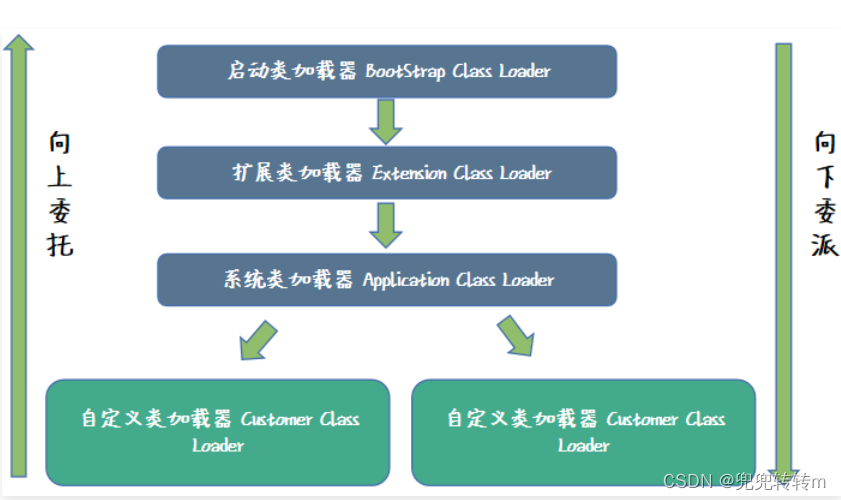 - 向上委托:如果一个类加载器收到了类加载请求,它并不会自己先去加载,而是把这个请求委托给父类的加载器去执行,如果父类加载器还存在其父类加载器,则进一步向上委托,依次递归,请求最终将到达顶层的启动类加载器。如果父类加载器可以完成类加载任务,就成功返回;(采用递归)