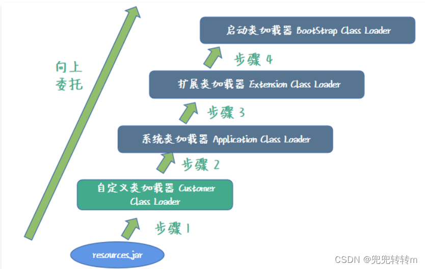 - 步骤 1:resources.jar 会先通过自定义类加载器(前提是我们实现了自定义类加载器),自定义类加载器不会做处理,直接向上委托给系统(System Application)类加载器;