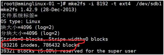 默认四个块对应一个inode,如果认为inode少,可以使用-i指定多少字节对应一个inode,如图