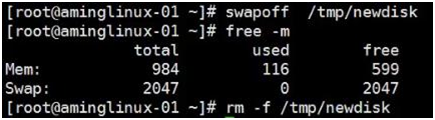 不用了卸载,使用swapoff /tmp/newdisk/,free -m查看内存使用情况