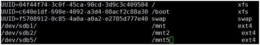 因为mount挂载在重启服务器后会失效,所以需要将分区信息写到/etc/fstab文件中让它永久挂载:
