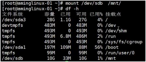 挂载mount:mount /dev/sdb1 /mnt/(挂载点)