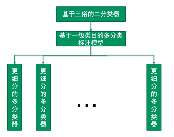 经过三俗分类器之后会构建一个基于一级类目的多标签标注模型,将用户query数据分类到各个一级类目中,最后就是根据不同的业务需求来进行文本识别了。这里一个小诀窍是对于一些多标签标注模型中某些效果不理想的标签,可以通过二分类器来重点识别,这样既可以享受到多标签标注模型的高效,还能享受到二分类器的高准确率。具体项目使用策略如下图所示: